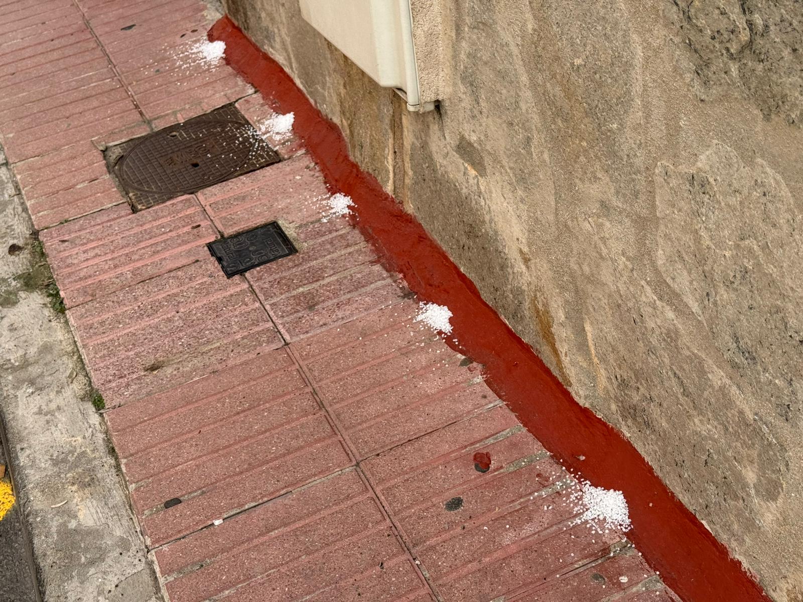 En las imágenes captadas se observa que el producto ha sido depositado sobre una franja roja de pintura impermeabilizante, un material utilizado habitualmente para proteger los edificios de las humedades. Se sospecha que el producto químico ha sido colocado de forma intencionada para ahuyentar a los animales y evitar que orinen en las paredes, una práctica que, de usar sustancias tóxicas, está estrictamente prohibida.