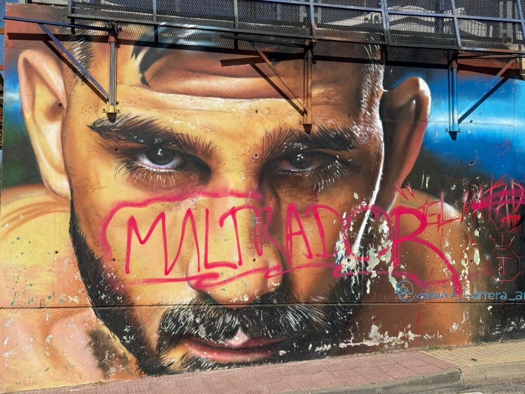 El mural dedicado a Ilia Topuria, que preside una de las paredes de San Sebastián de los Reyes desde febrero de 2024, presenta desde hace un tiempo diversas pintadas con el mensaje «maltratador». Estas inscripciones, realizadas sobre el rostro del deportista, hacen referencia al proceso legal que ha protagonizado el luchador en los últimos meses y afectan directamente a la obra creada por el artista David Barrera.